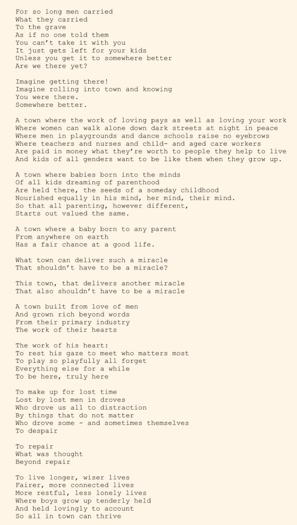 I stand by this poem’s message: that a town that holds its men and boys so they grow and stay strong, responsible and nurturing, is a fairer, safer, happier town for all.