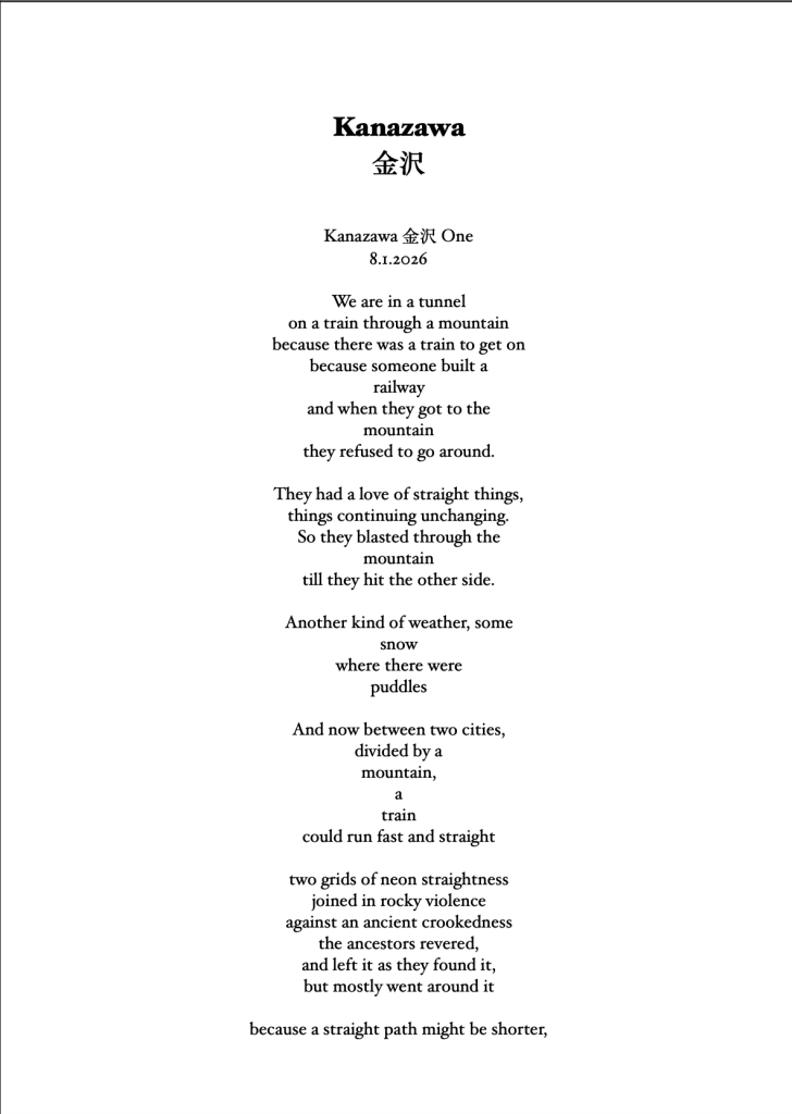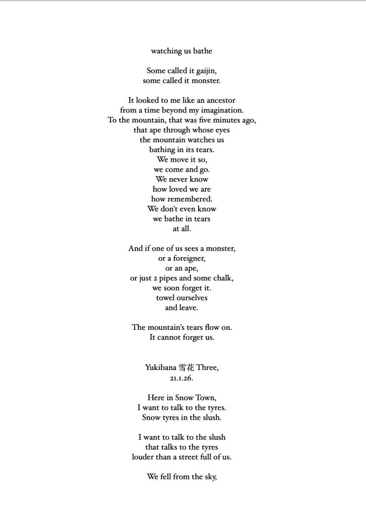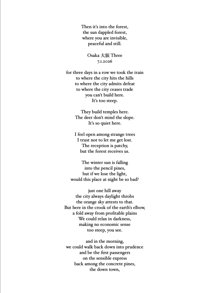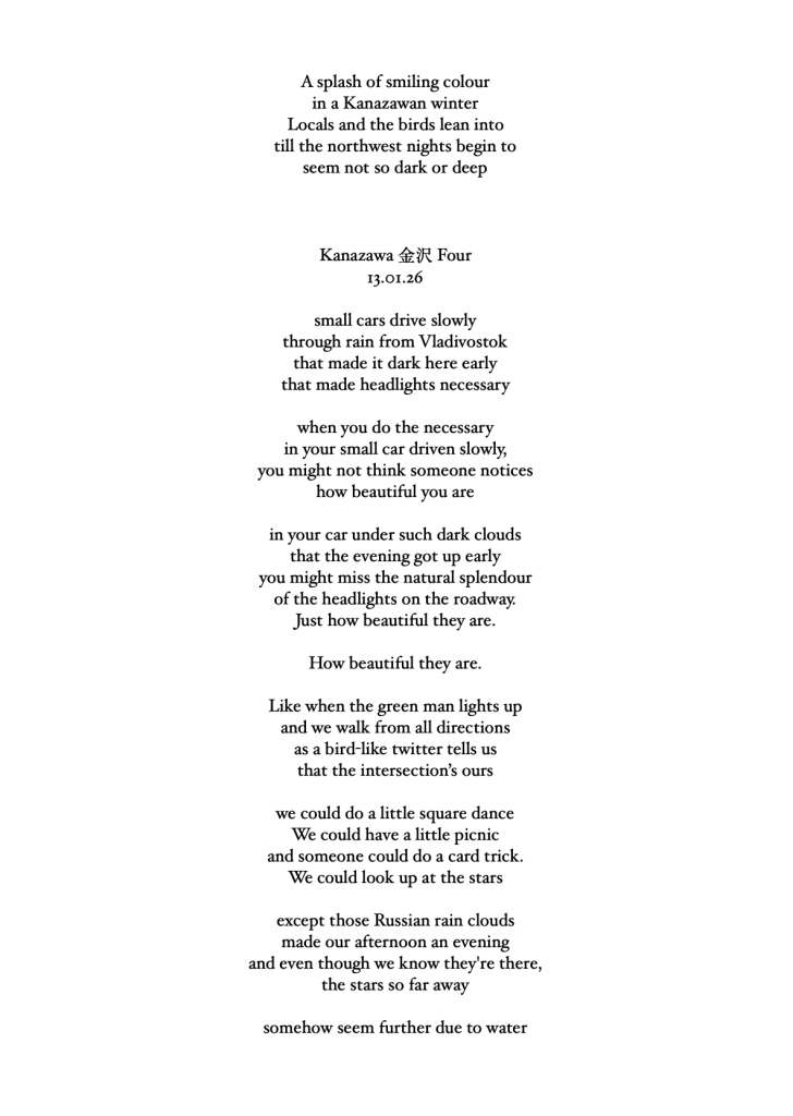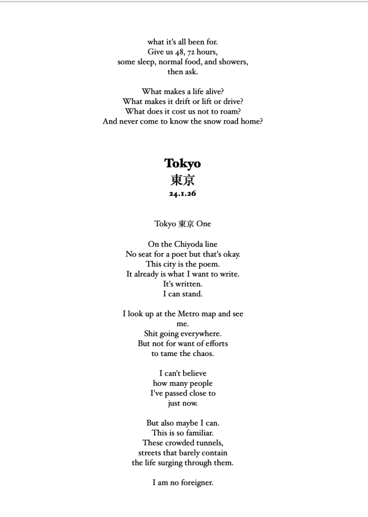 I hope to write some Bashō-style travelogue to go with these poems. I also hope to write some memoir, strands of narrative crossing 8000km to life at home, the stuff every traveler takes with them on the Narrow Road to the Deep North.