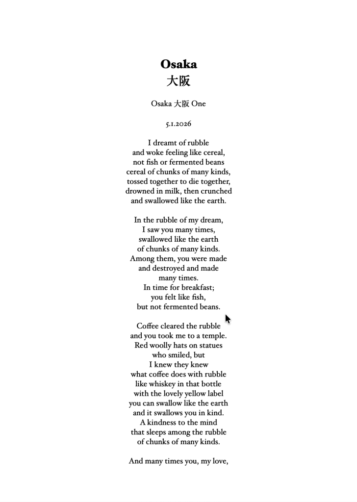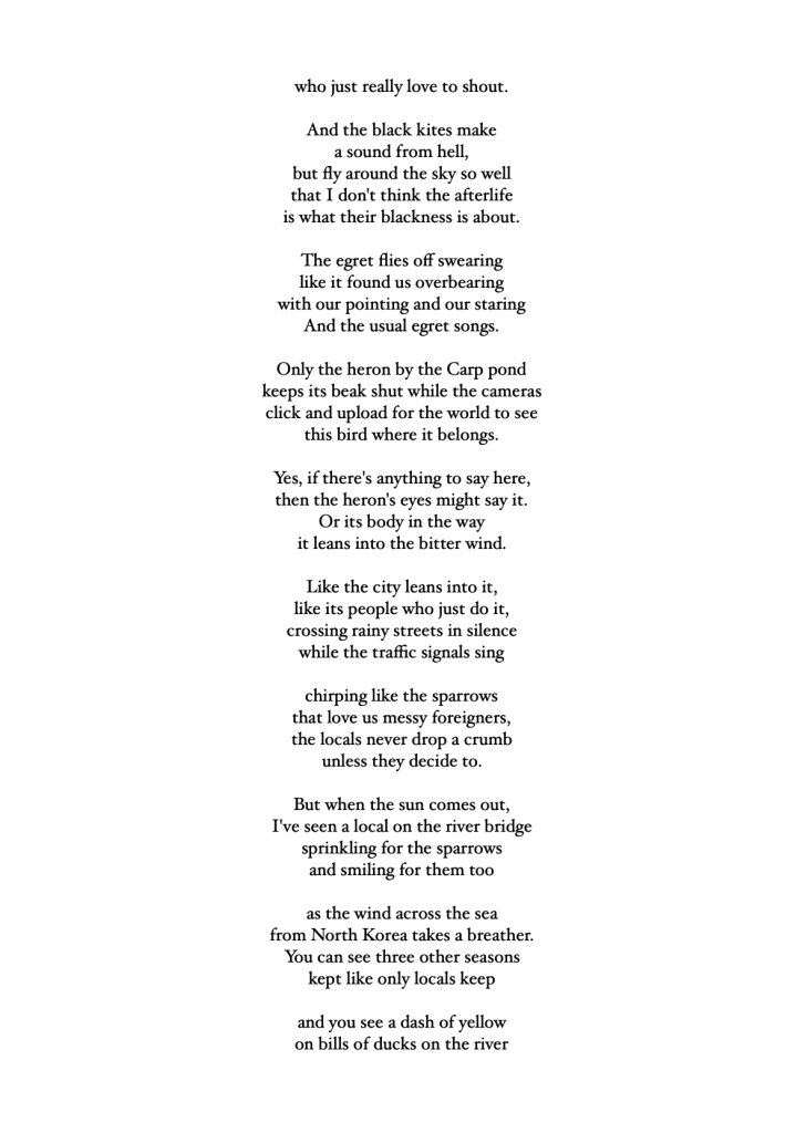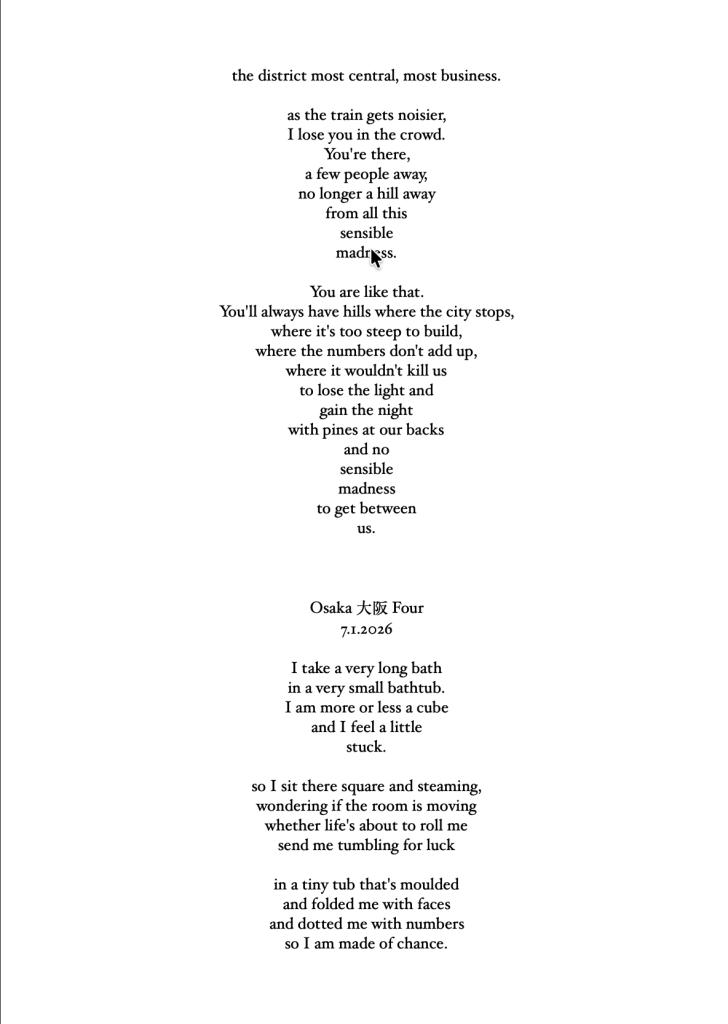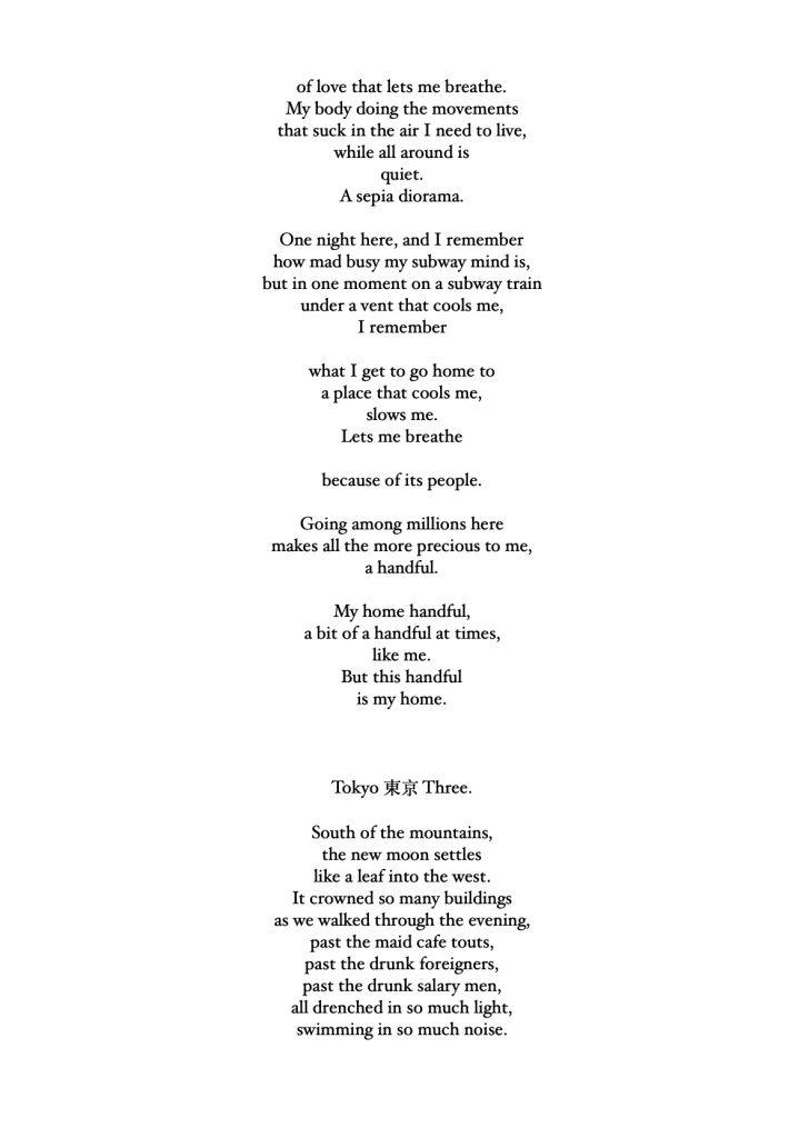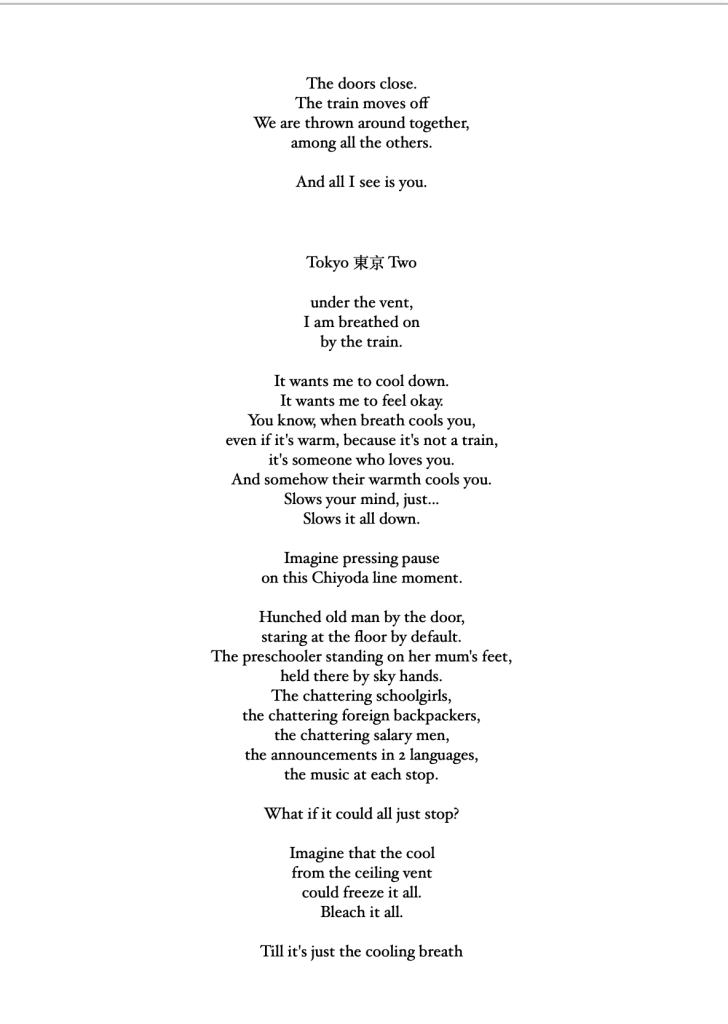 I hope to write some Bashō-style travelogue to go with these poems. I also hope to write some memoir, strands of narrative crossing 8000km to life at home, the stuff every traveler takes with them on the Narrow Road to the Deep North.