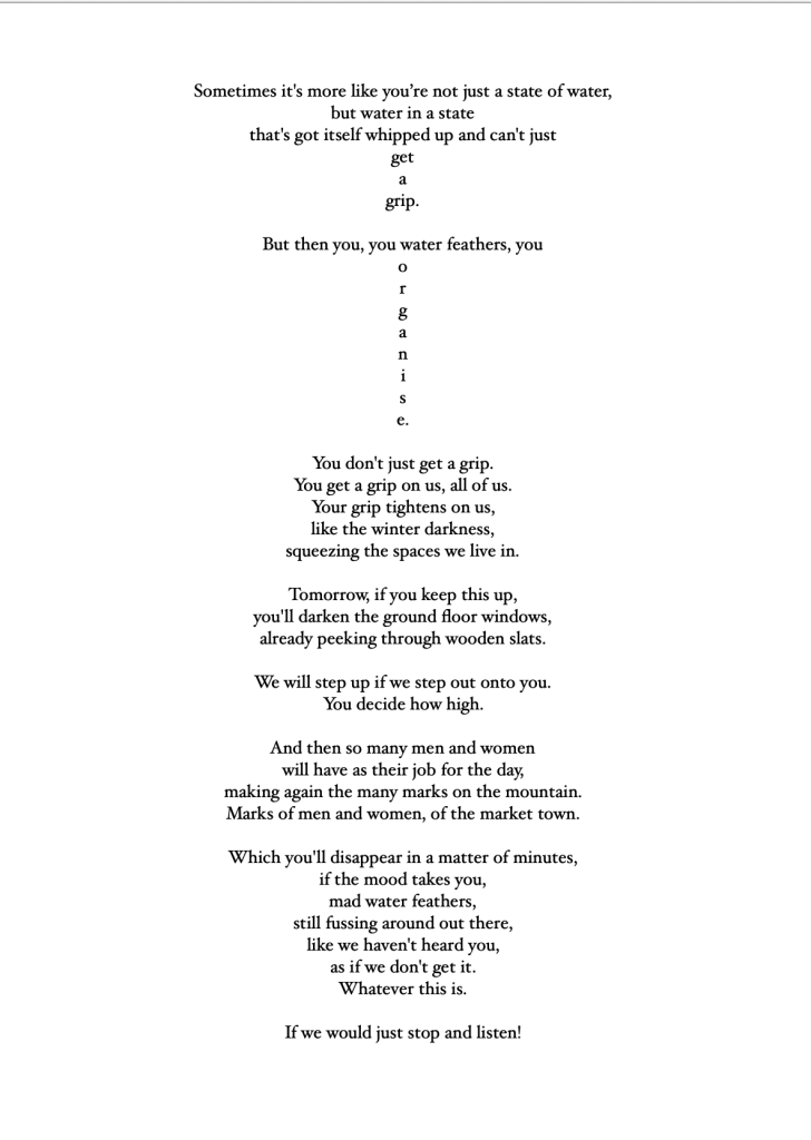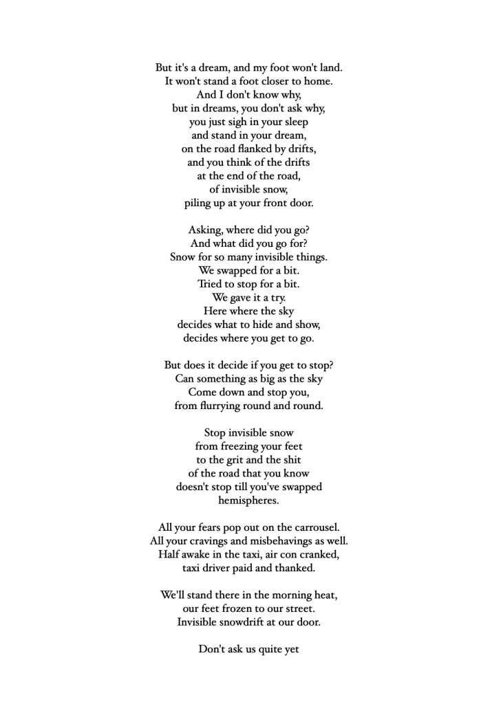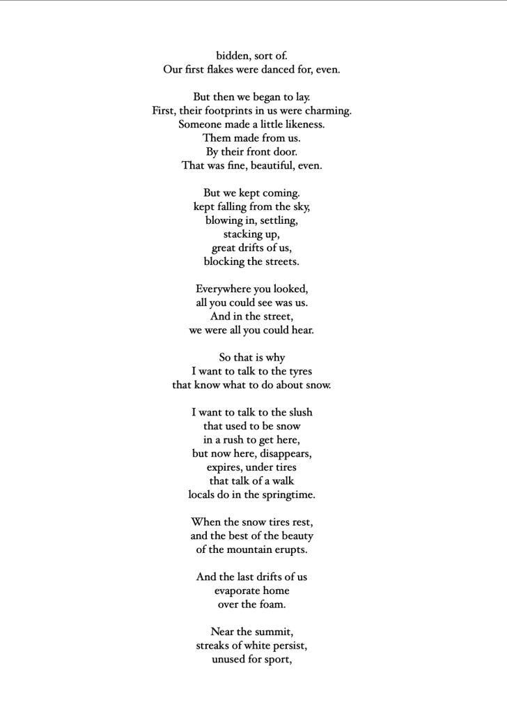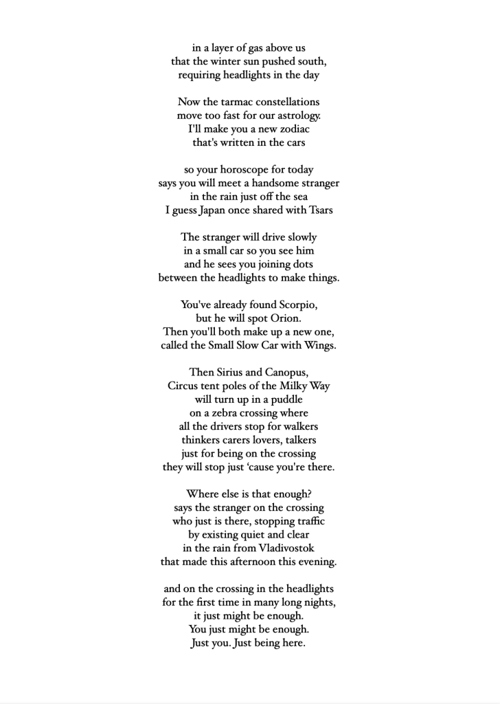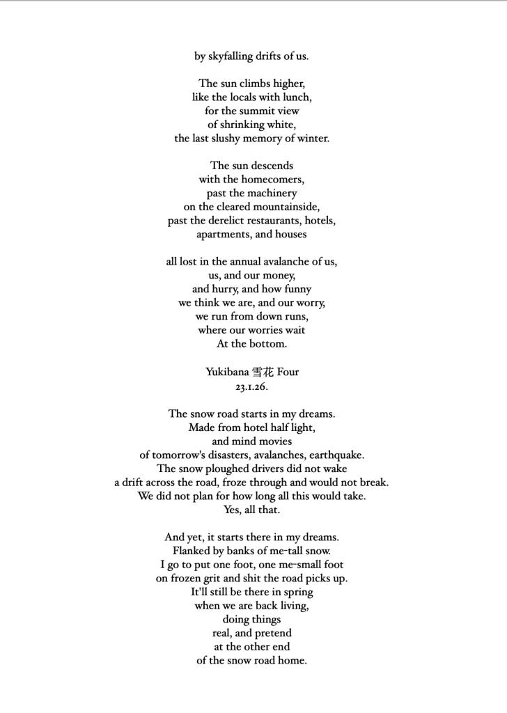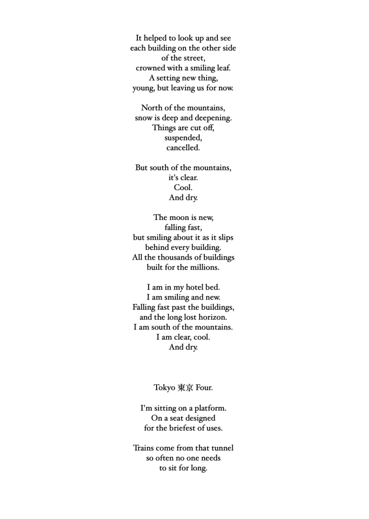 Unlike haiku, these 17 poems – 4 quartets and a centrepiece – just arrived in the moment unshepherded; in the hotel room, on the train, under a tree, in the snow, in a shopping centre. Some rhyme in places, some get a rhythm up, but all were followed with love and care to see where they went.