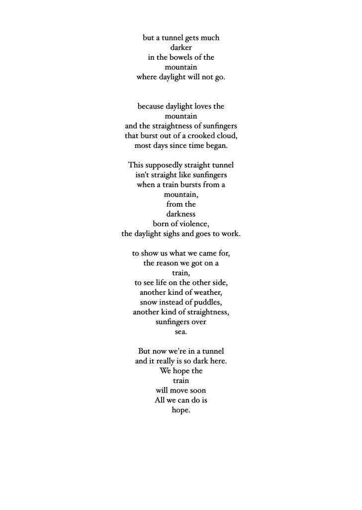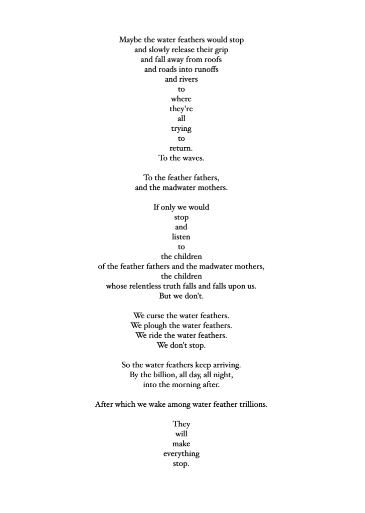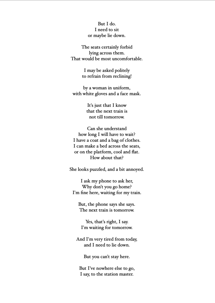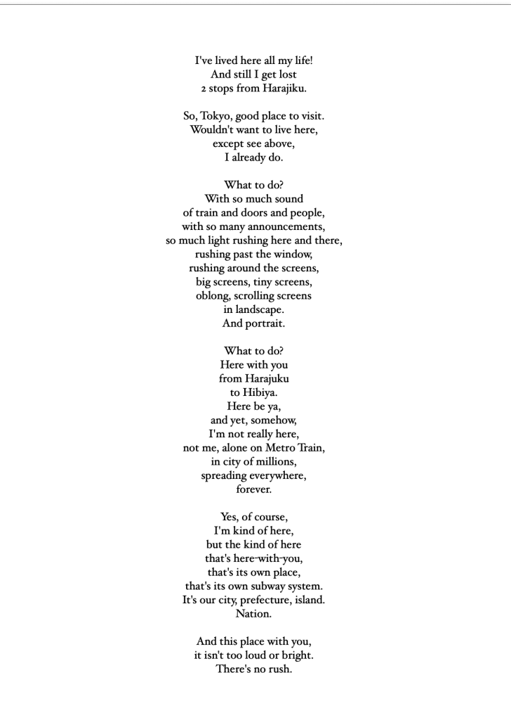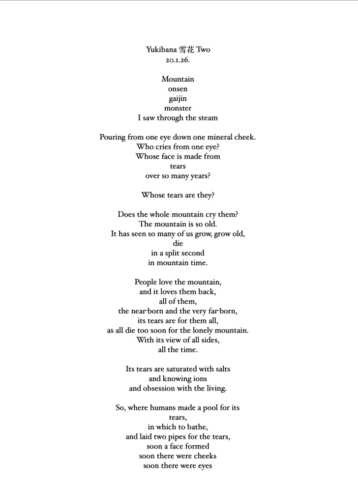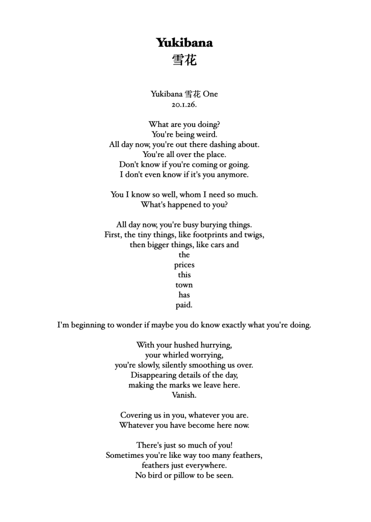 Unlike haiku, these 17 poems – 4 quartets and a centrepiece – just arrived in the moment unshepherded; in the hotel room, on the train, under a tree, in the snow, in a shopping centre. Some rhyme in places, some get a rhythm up, but all were followed with love and care to see where they went.